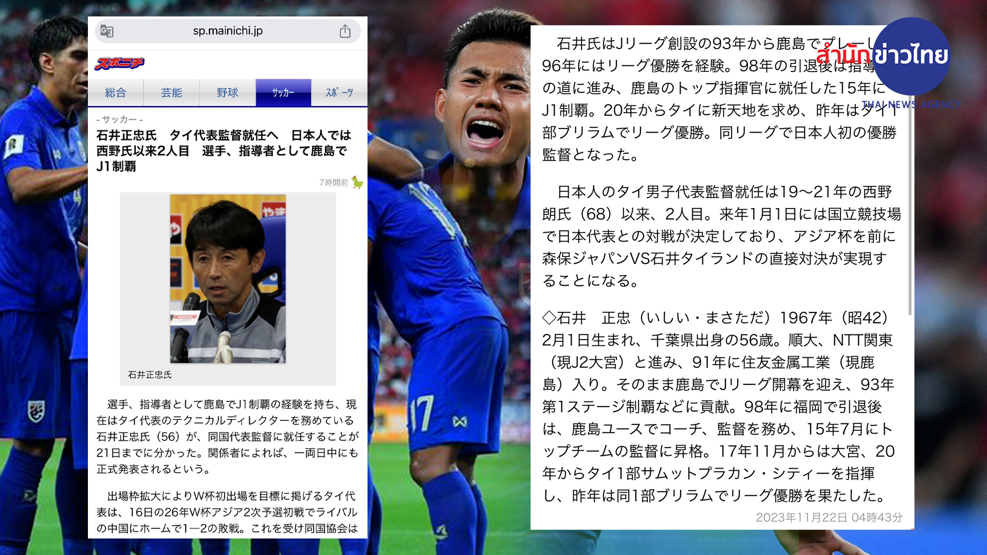 ญี่ปุ่น 22 พ.ย.- สื่อออนไลน์ของญี่ปุ่น ประโคมข่าว “มาซาทาดะ อิชิอิ” อดีตกุนซือบุรีรัมย์ ยูไนเต็ด เข้ามาคุมทีมชาติไทย แทน “มาโน โพลกิง” ส่วนนักเตะช้างศึกกลับถึงไทยแล้ว