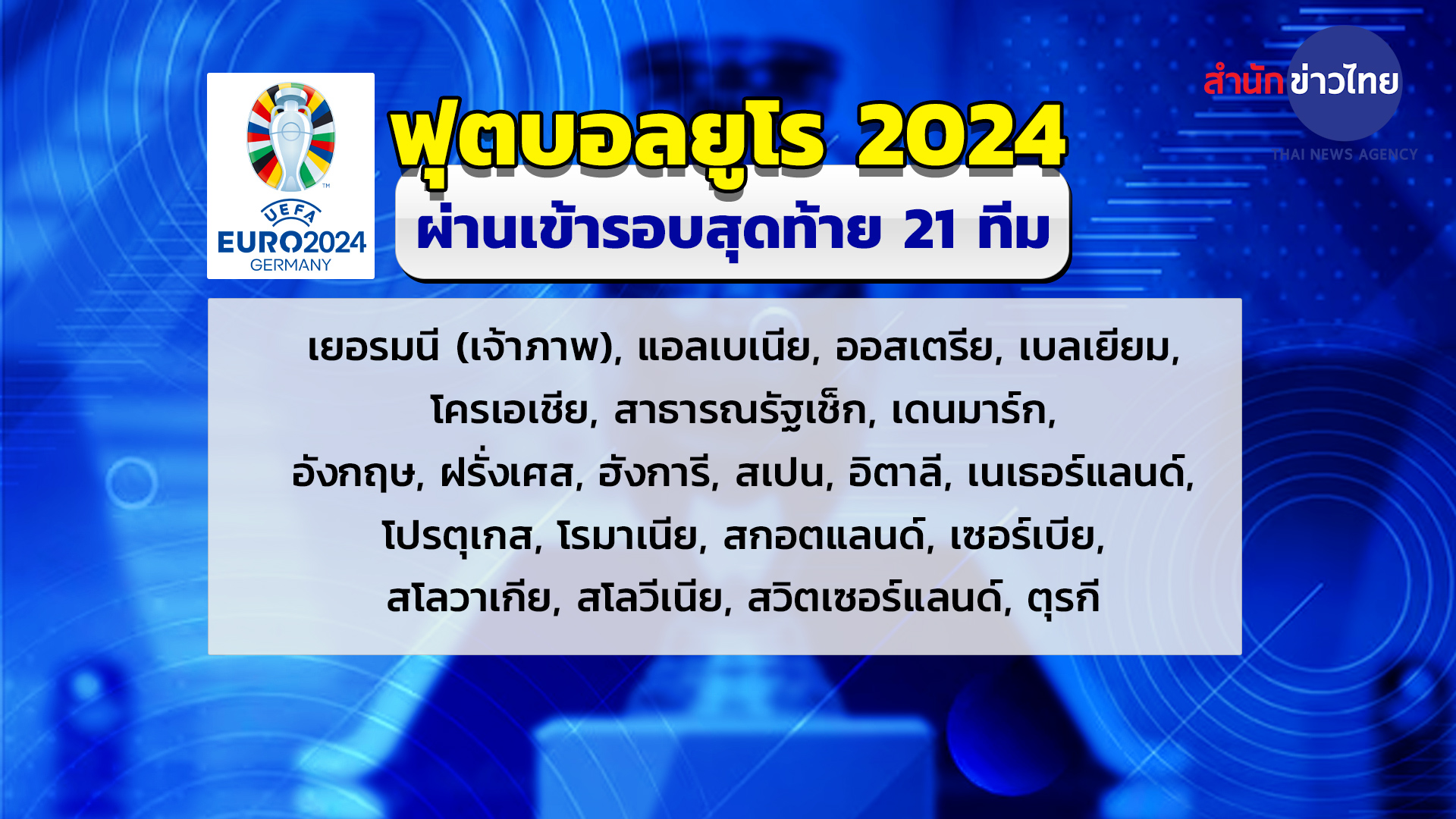 สำหรับศึกยูโร 2024 ได้ทีมผ่านเข้ารอบสุดท้ายเรียบร้อยแล้ว ทั้งหมด 21 ทีม ประกอบด้วย เยอรมนี (เจ้าภาพ), แอลเบเนีย, ออสเตรีย, เบลเยียม,โครเอเชีย, สาธารณรัฐเช็ก, เดนมาร์ก, อังกฤษ, ฝรั่งเศส, ฮังการี, สเปน, อิตาลี, เนเธอร์แลนด์, โปรตุเกส, โรมาเนีย, สกอตแลนด์, เซอร์เบีย, สโลวาเกีย, สโลวีเนีย, สวิตเซอร์แลนด์ และตุรกี