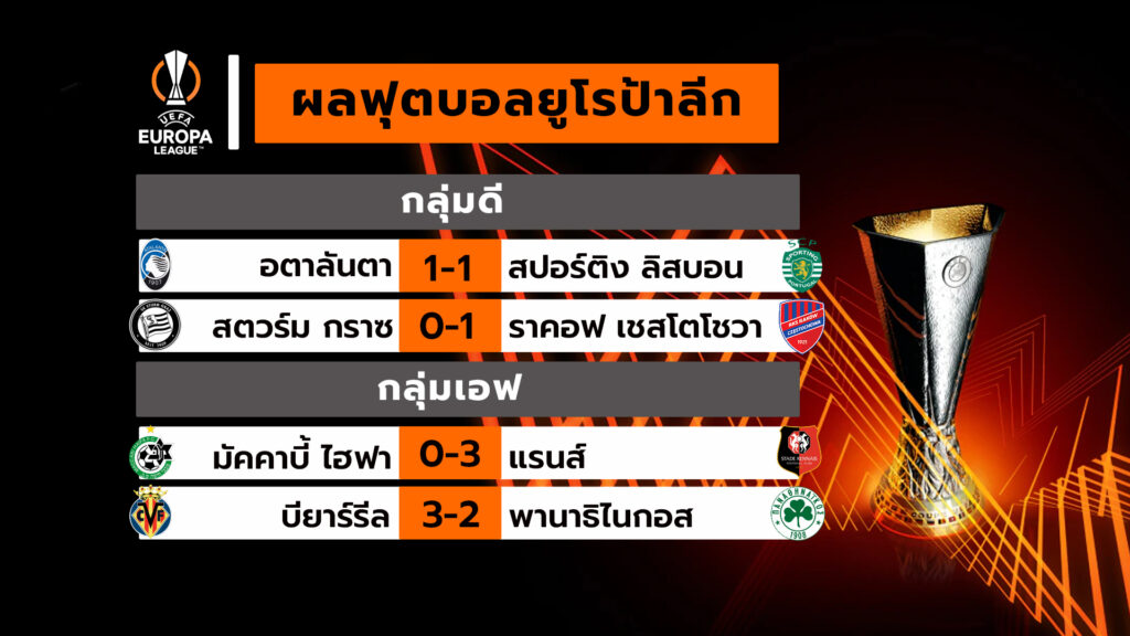 กลุ่ม ดี. อตาลันตา เสมอ สปอร์ติง ลิสบอน 1-1, สตวร์ม กราซ แพ้ ราคอฟ เชสโตโชวา 0-1