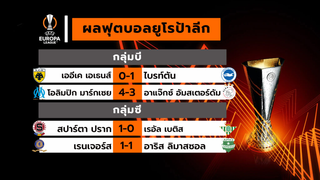 กลุ่ม บี. เออีเค เอเธนส์ แพ้ ไบรท์ตัน 0-1, โอลิมปิก มาร์กเซย ชนะ อาแจ๊กซ์ อัมสเตอร์ดัม 4-3