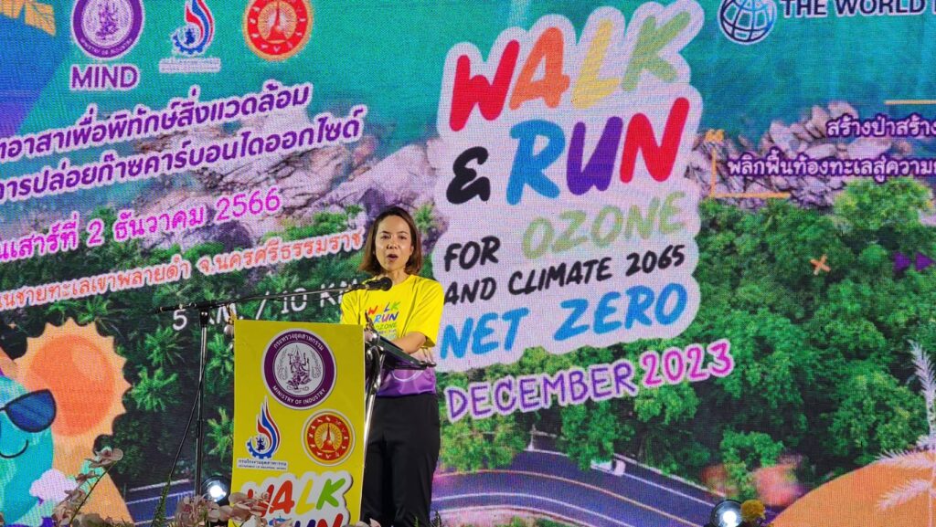 นายจุลพงษ์ ทวีศรี อธิบดีกรมโรงงานอุตสาหกรรม กล่าวว่า กระทรวงอุตสาหกรรมเป็นหน่วยงานหลักที่ได้รับมอบหมายจากรัฐบาลไทย ให้รับผิดชอบในการลดและเลิกใช้สารทำลายชั้นบรรยากาศโอโซนให้เป็นไปตามพันธกรณีภายใต้พิธีสารมอนทรีอออล โดยได้รับเงินช่วยเหลือแบบให้เปล่าจากกองทุนพหุภาคี จำนวนเงินกว่า 28 ล้านดอลลาร์สหรัฐ ผ่านธนาคารโลกในการดำเนินโครงการลดและเลิกใช้ สารไฮโดรคลอโรฟลูออโรคาร์บอน หรือสารเอชซีเอฟซี ซึ่งเป็นสารทำลายชั้นบรรยากาศ โอโซน ที่ประเทศไทยจะต้องเลิกใช้ภายในปี พ.ศ. 2573 จัดกิจกรรมเดิน-วิ่ง “Walk & Run for Ozone & Climate 2065 Net Zero” ใน 4 ภูมิภาค จัดมาแล้ว 3 ครั้ง ได้แก่ จ.ตรัง เมื่อวันที่7 ตุลาคม 2566 ที่ท่าเรือหาดปากเมง / จ.อุดรธานี เมื่อวันที่ 4 พฤศจิกายน 2566 ที่สวนสาธารณะหนองประจักษ์ศิลปาคม / จ.เชียงใหม่ เมื่อวันที่ 18 พฤศจิกายน 2566 ที่ปางช้างแม่แตง ทั้ง 3 ครั้ง มีผู้เข้าร่วมกิจกรรมรวมกว่า 3,000 คน และครั้งนี้เป็นครั้งที่ 4 ที่ถนนชายทะเล เขาพลายดำ จ.นครศรีธรรมราช มีผู้เข้าร่วมกิจกรรมกว่า 1,000 คน และครั้งสุดท้าย จะจัดขึ้น ณ สวนเบญจกิติ (สวนโรงงานยาสูบ) กรุงเทพมหานคร ในวันเสาร์ที่ 9 ธันวาคม 2566 กิจกรรมเดิน-วิ่ง “Walk & Run for Ozone and Climate 2065 Net Zero” แบ่งเป็น 2 รุ่น ได้แก่ รุ่น Fun Run ระยะทาง 5 กม. และรุ่นมินิมาราธอน ระยะทาง 10 กม. มีเงินรางวัลรวม 50,000 บาท