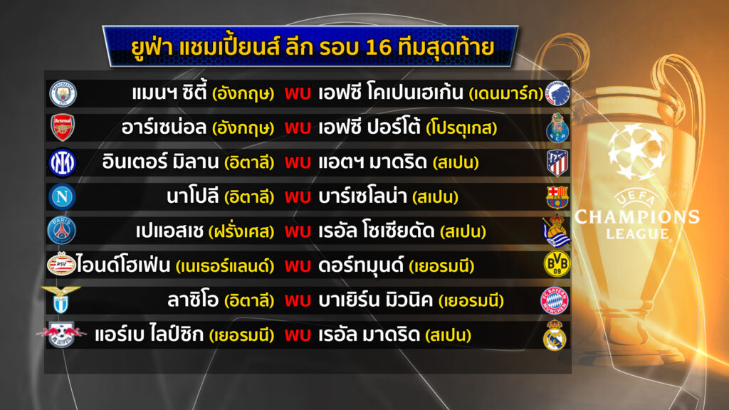 ผลการจับสลากประกบคู่ศึกยูฟ่า แชมเปียนส์ลีก รอบ 16 ทีมสุดท้าย ที่จะเตะนัดแรก วันที่ 13-14 และ 20-21 กุมภาพันธ์ปีหน้า ส่วนนัด 2 จะเตะกันวันที่ 5-6 และ 12-13 มีนาคมปีหน้า โดย “เรือใบสีฟ้า” แมนเชสเตอร์ ซิตี้ แชมป์เก่าจากอังกฤษ จะพบเอฟซี โคเปนเฮเกน จากเดนมาร์ก ที่เข้ารอบ 16 ทีมสุดท้ายเป็นครั้งแรกนับตั้งแต่ปี 2011 หลังเขี่ย “ปีศาจแดง” แมนเชสเตอร์ ยูไนเต็ด คู่แข่งร่วมเมืองตกรอบแบ่งกลุ่ม ส่วน “ปีนใหญ่” อาร์เซนอล อีกหนึ่งทีมจากอังกฤษ พบ เอฟซี ปอร์โต จากโปรตุเกส ส่วนบิ๊กแมตช์ในรอบนี้ “งูใหญ่” อินเตอร์ มิลาน รองแชมป์เก่าจากอิตาลี พบ “ตราหมี” แอตเลติโก้ มาดริด จากสเปน