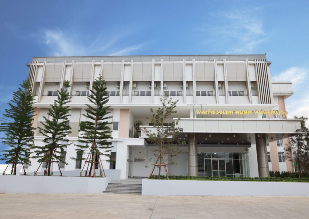 สำหรับ อาคารมูลนิธิพลตำรวจเอกสมยศ พุ่มพันธุ์ม่วง เป็นอาคาร 3 ชั้น ประกอบด้วย ชั้นที่ 1 แผนกอุบัติเหตุฉุกเฉิน, แผนกผู้ป่วยนอก, แผนกเวชระเบียน, แผนกเอกซเรย์, ห้องยา -ชั้นที่ 2 แผนกทันตกรรม, ห้องเทคนิคการแพทย์ (ห้อง Lab), งานประกันสุขภาพและเวชสารสนเทศ, ห้องผู้อำนวยการ, ห้องหัวหน้าพยาบาล และ ชั้นที่ 3 แผนกผู้ป่วยใน รับผู้ป่วยได้ 30 เตียง มีห้องพิเศษ 8 ห้อง