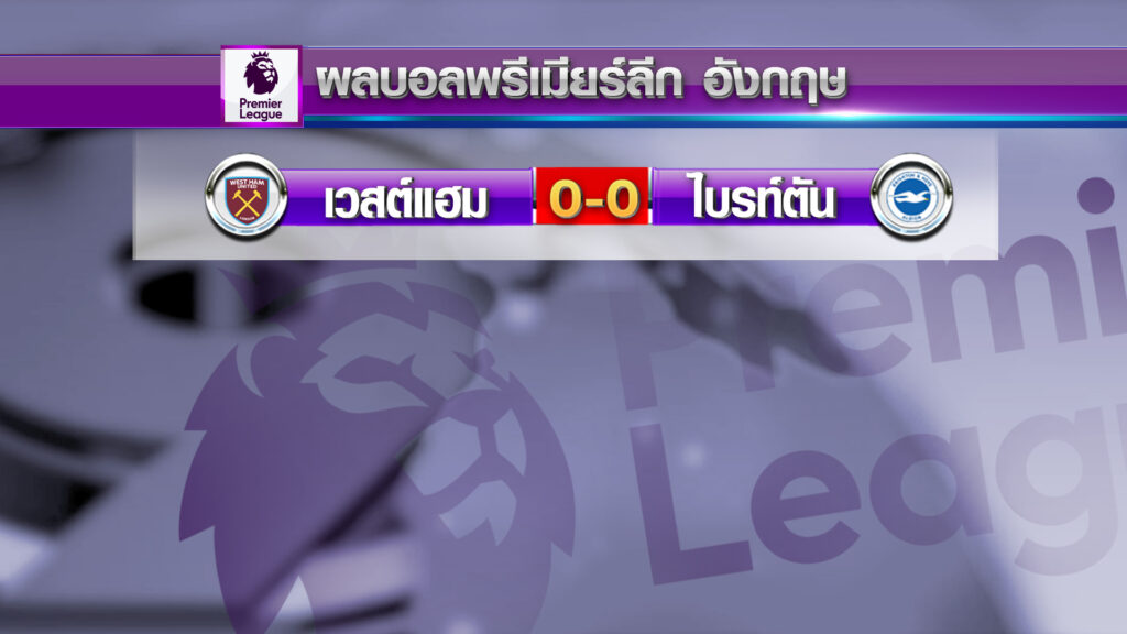 ด้านฟุตบอลพรีเมียร์ลีก อังกฤษ เมื่อคืนนี้ เวสต์แฮม ยูไนเต็ด เปิดบ้านเสมอกัน ไบรท์ตัน 0-0 ทำให้ขุนค้อนยังรั้งอันดับ 6 ของตารางมี 34 คะแนน ตามมาด้วยไบรท์ตัน อยู่อันดับ 7 มี 31 คะแนน