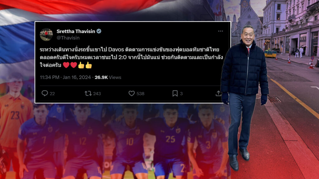 ด้าน นายเศรษฐา ทวีสิน นายกรัฐมนตรี และรมว.คลัง ซึ่งอยู่ที่ประเทศสวิตเซอร์แลนด์ ร่วมงานประชุม World Economic Forum ได้โพสต์ข้อความผ่านเอ็กซ์ ระบุว่า ระหว่างเดินทางนั่งรถขึ้นเขาไป Davos ติดตามการแข่งขันของฟุตบอลทีมชาติไทยตลอด ดีใจครับ หมดเวลาชนะไป 2:0 จากนี้ไปมันแน่ ช่วยกันติดตามและเป็นกำลังใจต่อครับ