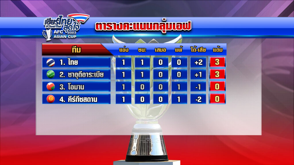 ฟุตบอล เอเชียน คัพ 2023 กลุ่มเอฟ นัดแรก ที่สนามอับดุลลาห์ บิน คาลิฟา สเตเดียม ประเทศกาตาร์ ทีมฟุตบอลชายทีมชาติไทยชุดใหญ่ อันดับ 113 ของโลก พบ คีร์กีซสถาน อันดับ 98 ของโลก นาทีที่ 26 ไทยในเสื้อสีน้ำเงินออกนำ 1-0 จากจังหวะยิงไกลของ บดินทร์ ผาลา ลูกมาเข้าทาง ศุภชัย ใจเด็ด ตามซ้ำเข้าไป ครึ่งหลังนาทีที่ 48 นิโคลัส มิคเกลสัน เปิดให้ สุภโชค สารชาติ โหม่ง แต่ลูกไปแฉลบกองหลังคีร์กีซสถานมาเข้าทาง ศุภชัย คนเดิมตามซ้ำจ่อ ๆ หน้าประตูให้ทีมช้างศึกหนีห่างเป็น 2-0 จบเกม ทีมชาติไทย เอาชนะ คีร์กีซสถาน ไป 2-0 พร้อมคว้าสามแต้มแรกไปครอง