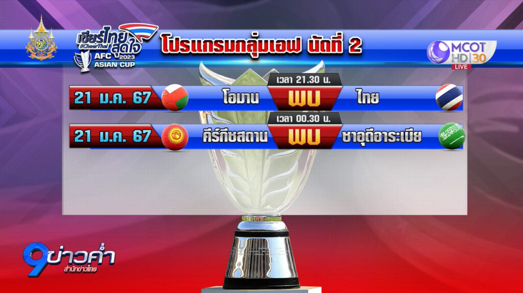 สำหรับนัดที่ 2 กลุ่ม เอฟ วันที่ 21 มกราคม ทีมชาติไทย จะลงสนามพบ โอมาน เวลา 21.30 น. ตามเวลาประเทศไทย ส่วน ซาอุดีอาระเบีย พบ คีร์กีซสถาน เวลาเที่ยงคืนครึ่ง .-สำนักข่าวไทย