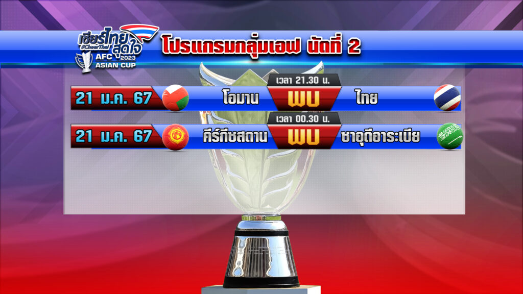ด้าน “โค้ชเตี้ย” สะสม พบประเสริฐ อดีตนักเตะทีมชาติให้ทรรศนะก่อนเกมไทยกับโอมานว่า ไทยมีโอกาสที่จะเก็บ 3 คะแนนได้อีกครั้ง นัดต่อไปในกลุ่มเอฟ ไทย จะลงสนามพบ โอมาน ในวันที่ 21 มกราคม เวลา 21.30 น. ตามเวลาประเทศไทย ส่วน ซาอุดีอาระเบีย จะพบกับ คีร์กีซสถาน ในวันเดียวกัน เวลาเที่ยงคืนครึ่ง .-สำนักข่าวไทย