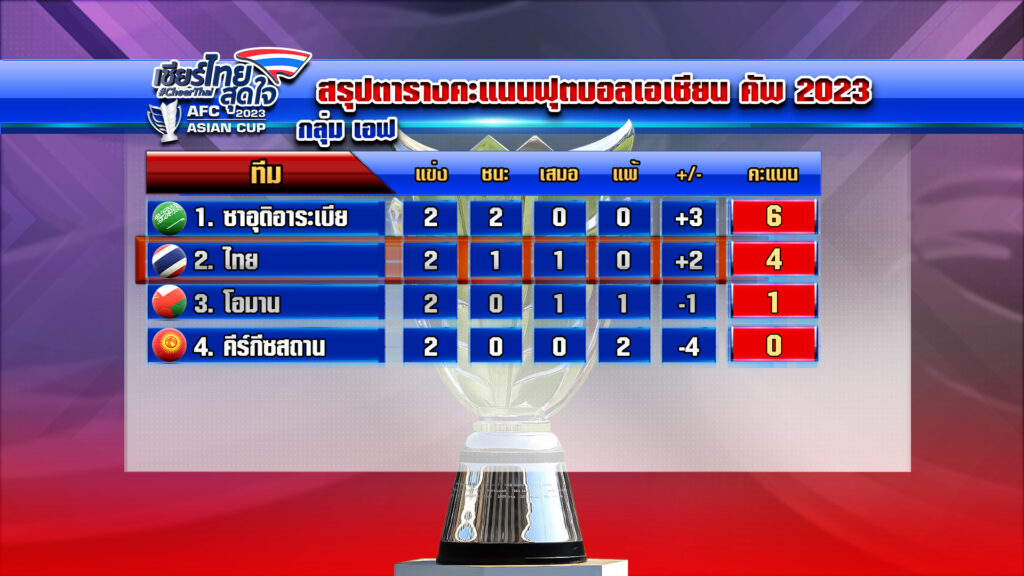 สรุปตารางคะแนน ทำให้ ซาอุิอาระเบีย ขึ้นนำจ่าฝูงของกลุ่ม มี 6 คะแนน อันดับ 2 ทีมไทย มี 4 คะแนน อันดับ 3 โอมาน มี 1 คะแนน อันดับ 4 คีร์กีซสถาน ไม่มีคะแนน โดยนัดต่อไปทีมชาติไทย จะพบกับ ซาอุดิอาระเบีย วันที่ 25 มกราคม เวลา 22 นาฬิกา ส่วนโอมาน พบกับ คีร์กีซสถาน เวลา 22 นาฬิกาเช่นกัน.-สำนักข่าวไทย