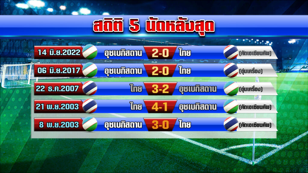 สถิติการพบกันของทั้งสองทีม 5 นัดหลังสุด ไทยเอาชนะได้ 2 ครั้ง ในฟุตบอลอุ่นเครื่องเมื่อปี 2007 ด้วยสกอร์ 3-1 และฟุตบอลเอเชียนคัพ รอบคัดเลือกปี 2003 ไทยชนะได้ 4-1 ขณะที่ 5 นัดหลัง อุซเบกิสถาน ชนะได้มากกว่า คือ 3 ครั้ง