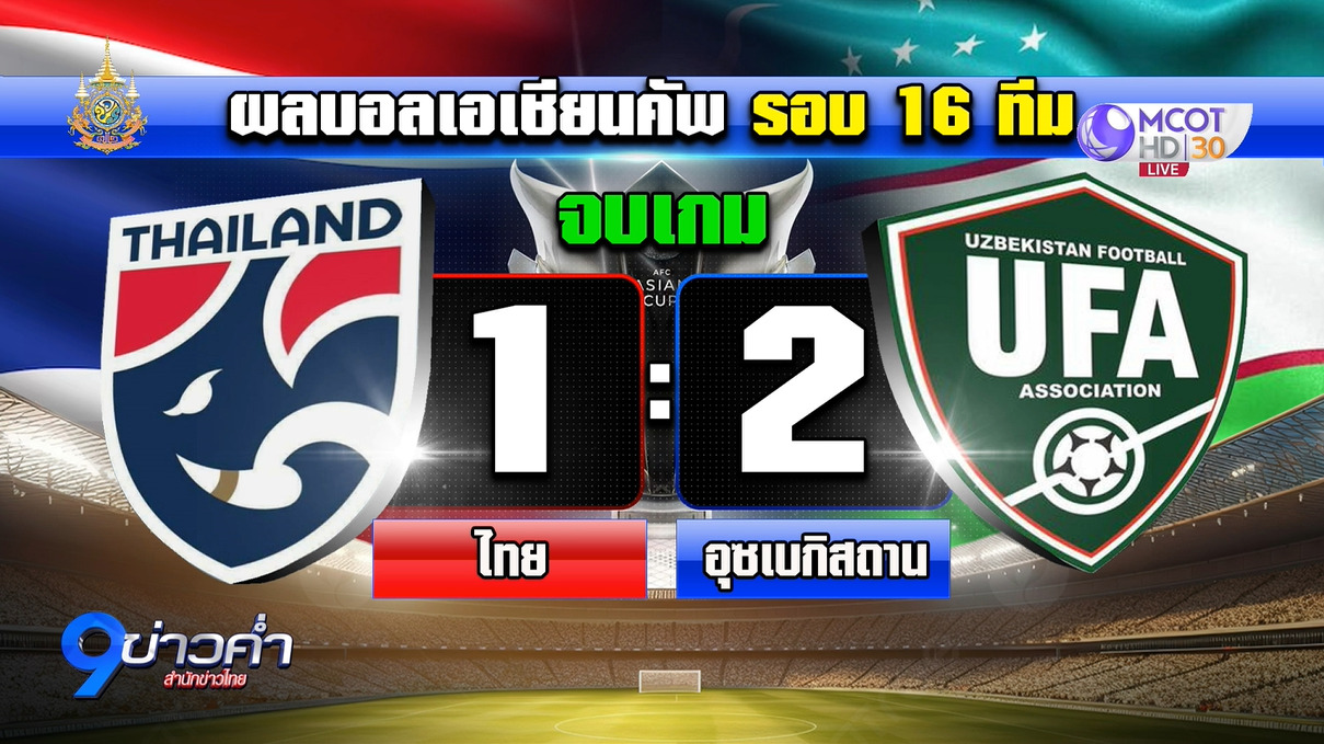 ท้ายเกมทีมชาติไทยบุกหนัก แต่ยิงประตูไม่ได้ จบเกม ทีมชาติไทย พ่าย อุซเบกิสถาน 1-2 ตกรอบไปอย่างเสียดาย ส่วนอุซเบกิสถาน ผ่านเข้ารอบ 8 ทีมสุดท้าย ไปพบกับ กาตาร์ เจ้าภาพ แชมป์เก่า ในวันที่ 3 กุมภาพันธ์ .-สำนักข่าวไทย