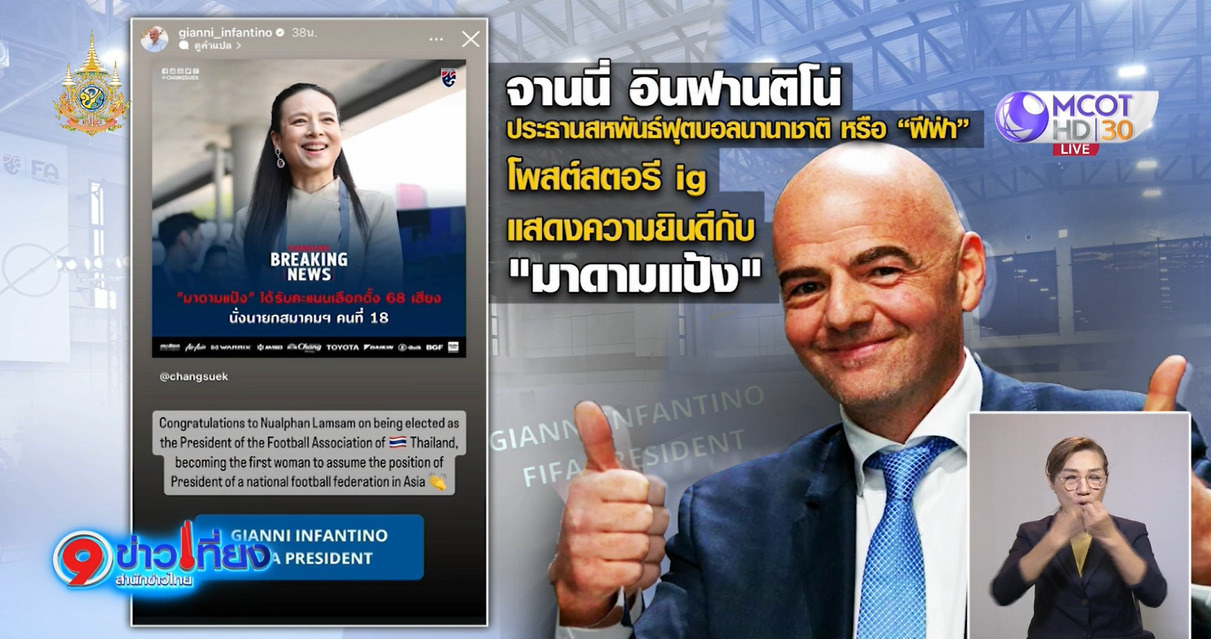 กทม. 9 ก.พ.-ประธานฟีฟ่า ร่วมแสดงความยินกับ “มาดามแป้ง” นวลพรรณ ล่ำซำ ที่ได้รับเลือกเป็นนายกสมาคมฟุตบอลแห่งประเทศไทยคนใหม่