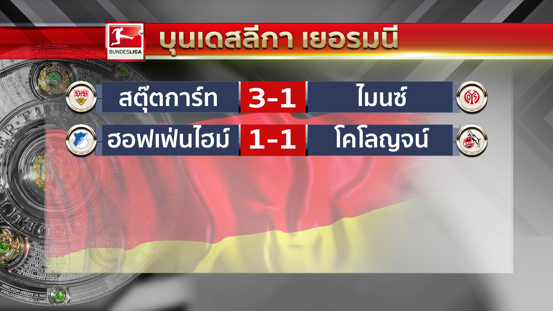ฟุตบอลบุนเดสลีกา เยอรมนี เมื่อคืนนี้ สตุ๊ดการ์ด ในชุดสีขาว เปิดบ้านพบ ไมนซ์ เกมนี้ เจ้าถิ่นนำก่อนจากจังหวะได้ซัดในเขตโทษของ แมกซิมิเลียน มิทเทิลส์เทิดท์ นาทีที่ 45+1 จากนั้น เจ้าถิ่นมาได้ประตูที่ 2 ในอีก 2 นาทีต่อมาเมื่อ เจมี เลเวลิง เกี่ยวบอลเข้าไปซัดจ่อ ๆ จบครึ่งแรกม้าขาวนำ 2-0 ครึ่งหลัง นาทีที่ 73 เดนิซ อุนดาฟ เลี้ยงหลบกองหลังเข้ายิงประตูให้เจ้าถิ่นนำห่าง 3-0 แต่ท้ายเกมไมนซ์ มาได้ประตูปลอบใจจากการโขกของ ลูโดวิช อยอร์เก นาทีที่ 76 แต่ไล่ไม่ทัน จบเกม สตุ๊ดการ์ด ชนะ ไมนซ์ 3-1 เตะ 21 นัดมี 42 คะแนน อยู่อันดับ 3 ส่วน ไมนซ์ อยู่ที่ 17 มี 12 คะแนน