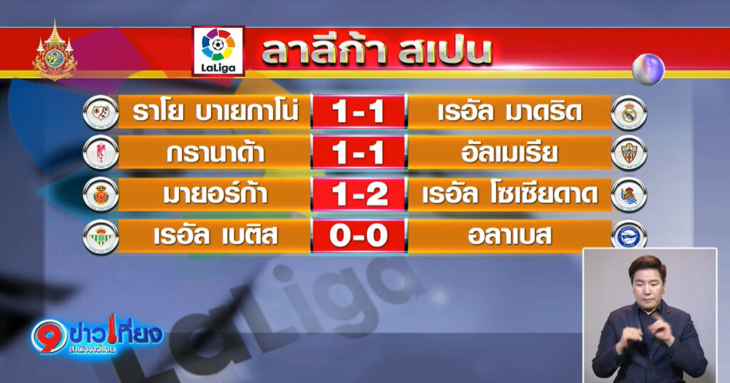 ฟุตบอล ลาลีกา สเปน “ราชันชุดขาว” เรอัล มาดริด บุกเสมอ ราโย บาเยกาโน่ 1-1 กรานาด้า เสมอ อัลเมเรีย 1-1 มาร์ยอร์ก้า แพ้ เรอัล โซเซียดาด 1-2 เรอัล เบติส เสมอ อลาเบส 0-0