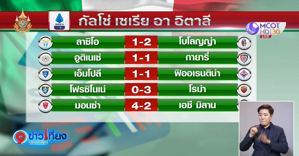 ฟุตบอลกัลโช่ เซเรีย อา อิตาลี ลาซิโอ แพ้ โบโลญญ่า 1-2 อูดิเนเซ่ เสมอ กายารี่ 1-1 เอ็มโปลี เสมอ ฟิออเรติน่า 1-1 โฟรซิโนเน่ แพ้ โรม่า 0-3 มอนซ่า ชนะ เอซี มิลาน 4-2.-สำนักข่าวไทย