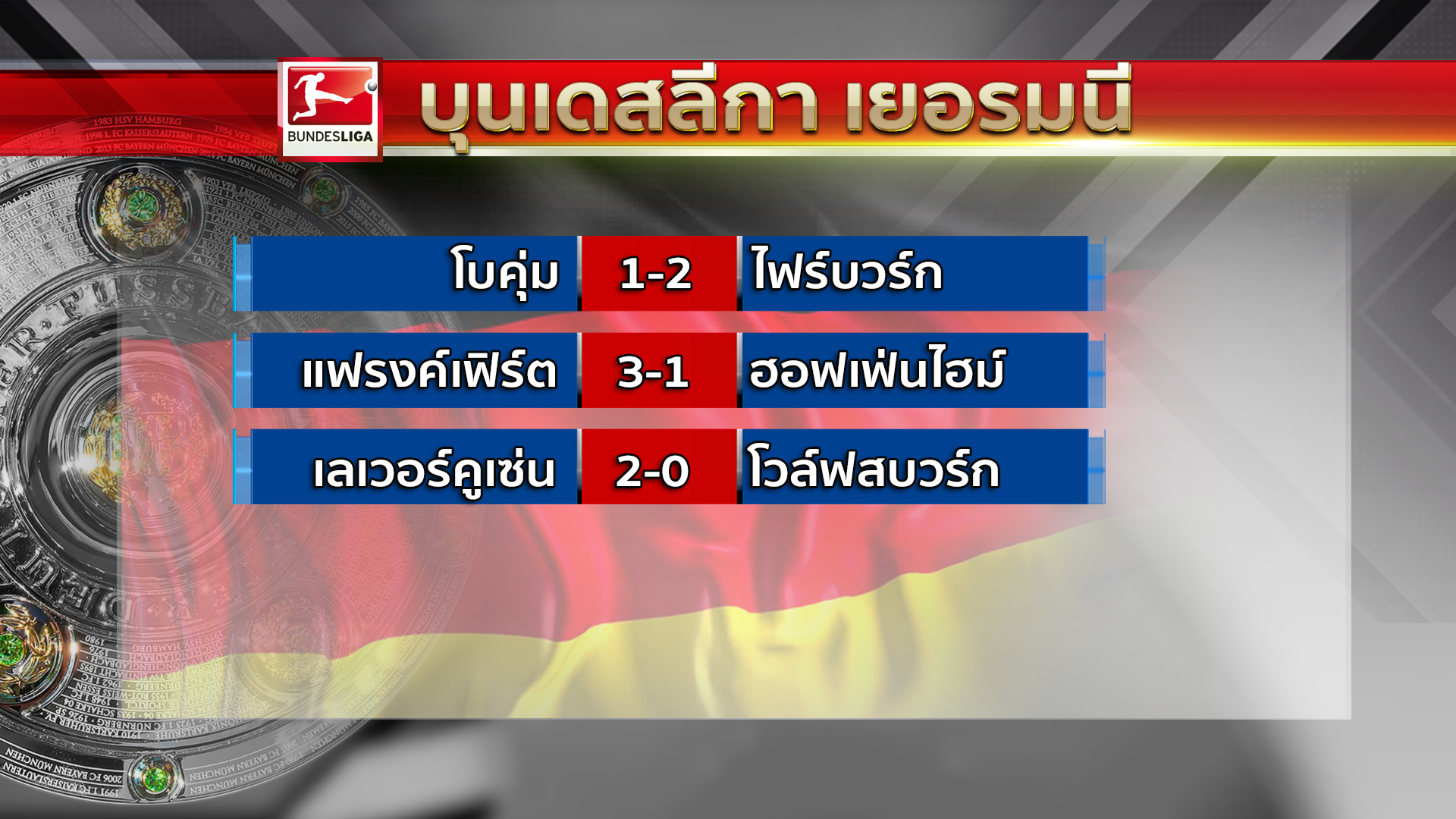 ส่วนผลอีก 2 คู่ โบคุ่ม แพ้ ไฟร์บวร์ก 1-2 และ แฟรงค์เฟิร์ต ชนะ ฮอฟเฟ่นไฮม์ 3-1