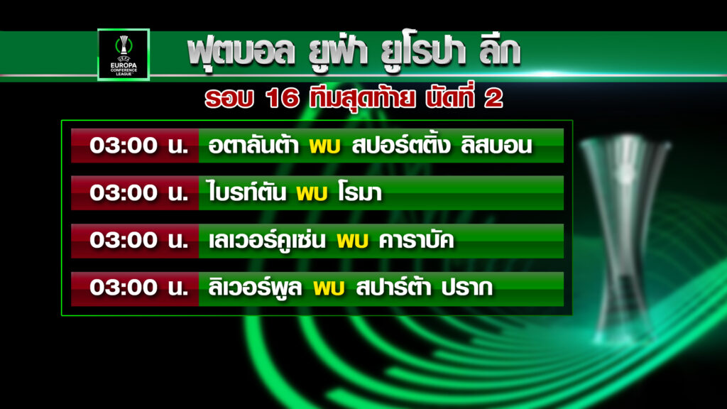 ส่วนคู่อื่นๆ เวลา 00.45 น. เรนเจอร์ เปิดบ้านพบ เบนฟิกา, บียาร์เรอัล พบ โอลิมปิค มาร์เซย์ และ เวสต์แฮม ยูไนเต็ด พบ ไฟร์บวร์ก ขณะที่ เวลา 03.00 น. อตาลันตา พบ สปอร์ตติง ลิสบอน และ ไบรท์ตัน พบ โรมา .-สำนักข่าวไทย