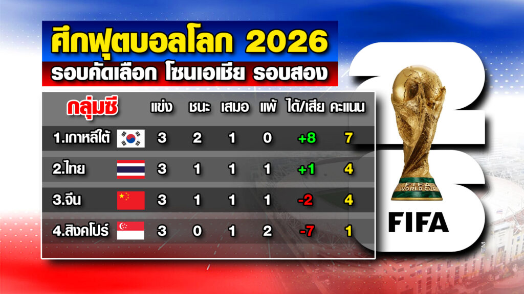 สรุปตารางคะแนนของกลุ่มซี. เกาหลีใต้ แข่ง 3 นัด มี 7 คะแนน นำเป็นจ่าฝูง ส่วนทีมไทย อยู่อันดับ 2 ของกลุ่มมี 4 คะแนน เท่ากับจีน แต่ประตูได้เสียดีกว่า หลังจีนทำได้เพียงแค่บุกไปเสมอกับ สิงคโปร์ 2-2 ขณะที่สิงคโปร์ มี 1 คะแนน อยู่อันดับ 4