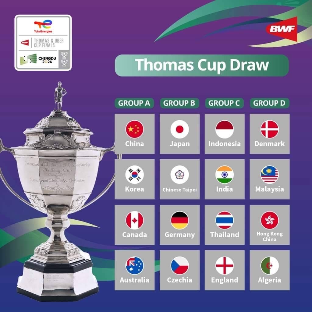 22 มี.ค.67 ที่ผ่านมา สหพันธ์แบดมินตันโลก (BWF) ได้มีการจับสลากแบ่งสายการแข่งขันแบดมินตันประเภททีมชายทีมหญิงชิงแชมป์โลกโธมัส-อูเบอร์ คัพ ไฟนอลส์ 2024 ที่เมืองเฉินตู สาธารณรัฐประชาชนจีน