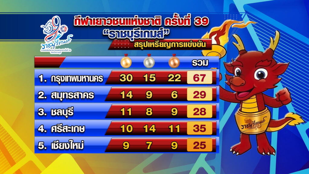 สรุปเหรียญรางวัล นักกีฬาจากกรุงเทพนำมาเป็นอันดับ 1 มี 30 เหรียญทอง ตามมาด้วยสมุทรสาคร 14 เหรียญทอง .-สำนักข่าวไทย