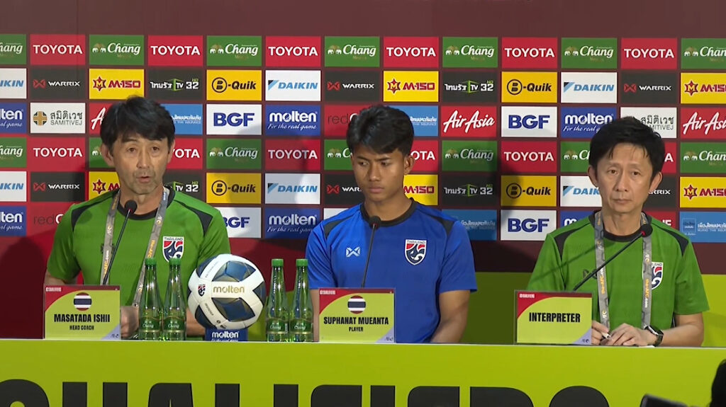 ก่อนเกมฟุตบอลทีมชาติไทย จะลงสนามศึกฟุตบอลโลก 2026 รอบคัดเลือก โซนเอเชีย รอบสอง นัดที่ 4 กับ เกาหลีใต้ อันดับที่ 22 ของโลก ในวันพรุ่งนี้ เมื่อช่วงเย็นที่ผ่านมา มาซาทาดะ อิชิอิ กุนซือทีมชาติไทย ได้แถลงข่าวความพร้อมห้องแถลงข่าวราชมังคลากีใฬาสถาน พร้อมด้วยศุภณัฏฐ์ เหมือนตา กองหน้าทีมชาติไทย ที่ยิงประตูตีเสมอให้ไทยในเกมแรก
