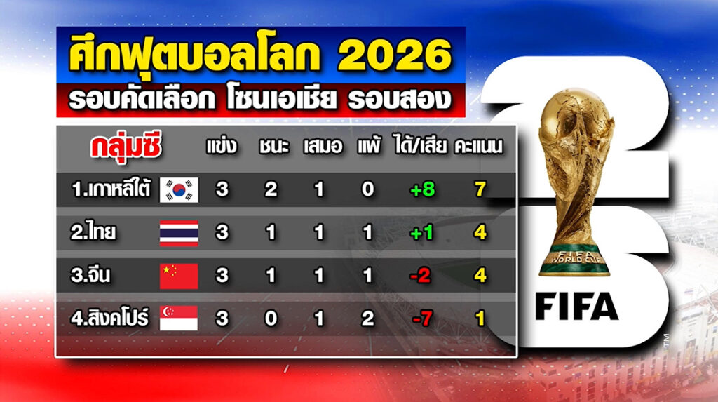 สรุปตารางคะแนนหลังผ่านไปแล้ว 3 นัด เกาหลีใต้ มี 7 คะแนน นำเป็นจ่าฝูง ส่วนทีมไทย อยู่อันดับ 2 มี 4 คะแนน เท่ากับจีน แต่ประตูได้เสียดีกว่า สิงคโปร์ มี 1 คะแนน อยู่อันดับ 4 .-สำนักข่าวไทย