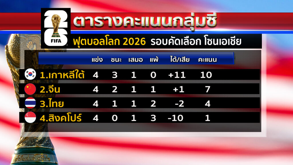 ผลอีกคู่ในกลุ่มซี จีน ชนะ สิงคโปร์ 4-1 ทำให้สรุปตารางคะแนนในตอนนี้ เกาหลีใต้ นำเป็นจ่าฝูง เตะ 4 นัดมี 10 คะแนน จีน อันดับ 2 มี 7 คะแนน และไทยอันดับ 3 มี 4 คะแนน ขณะที่สิงคโปร์อยู่อันดับสุดท้ายมี 1 คะแนน