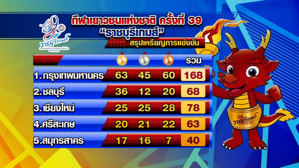 สรุปเหรียญ นักกีฬาเยาวชนจากกรุงเทพมหานคร ยังนำโด่งมาเป็นอันดับ 1 มี 63 เหรียญทอง 45 เหรียญเงิน 60 เหรียญทองแดง ตามมาด้วยชลบุรี 36 เหรียญทอง และอันดับ 3 เชียงใหม่ 25 เหรียญทอง .-สำนักข่าวไทย