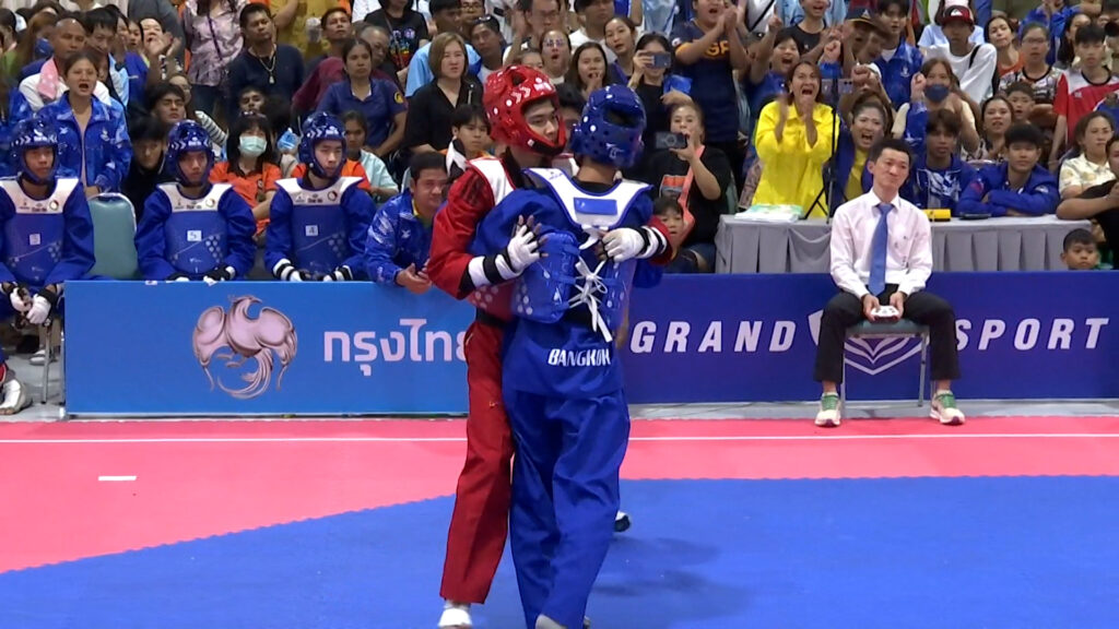 เทควันโด ชิง 7 เหรียญทอง ที่มรภ.หมู่บ้านจอมบึงประเภทต่อสู้ทีมชาย 5 คน รอบชิงชนะเลิศ กรุงเทพมหานคร ฝ่ายน้ำเงิน พบกับ ปทุมธานี ที่มี เทวินทร์ หาญปราบ นักกีฬาเทควันโดทีมชาติไทย เจ้าของเหรียญเงินโอลิมปิกเป็นผู้ฝึกสอน โดยการแข่งขันแบ่งเป็น 2 ยกๆ ละ 5 นาที ผลปรากฏว่า ยกแรก ปทุมธานี เริ่มต้นได้ดีขึ้นนำก่อน 20-16 คะแนน แต่ยกสอง กรุงเทพมหานคร วางแผนมาดี พลิกแซงชนะในช่วงท้าย 40-32 คะแนน คว้าเหรียญทองไปครองแบบสะใจกองเชียร์