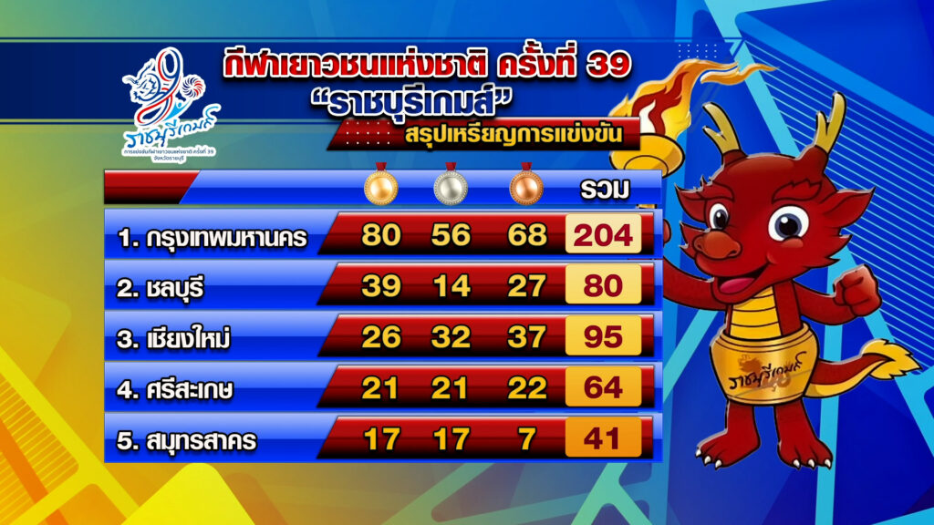 สรุปเหรียญ นักกีฬาเยาวชนจากกรุงเทพมหานคร ยังนำโด่งมาเป็นอันดับ 1 มี เหรียญทอง เหรียญเงิน เหรียญทองแดง ตามมาด้วยชลบุรี เหรียญทอง และอันดับ 3 เชียงใหม่ เหรียญทอง .-สำนักข่าวไทย