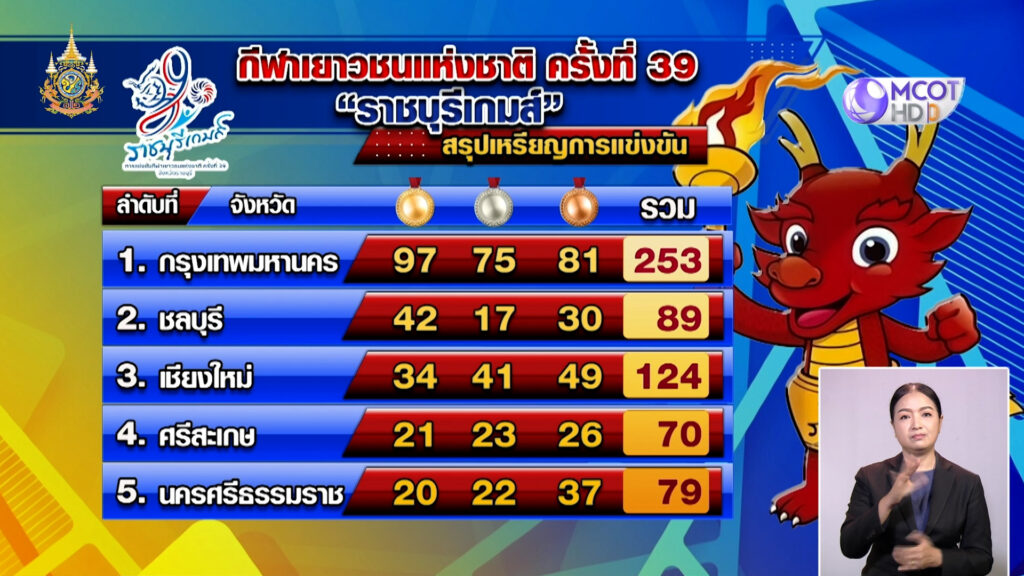 สรุปเหรียญ นักกีฬาเยาวชนจากกรุงเทพมหานคร ยังนำโด่งมาเป็นอันดับ 1 มี 97 เหรียญทอง 75 เหรียญเงิน 81 เหรียญทองแดง ตามมาด้วยชลบุรี 42 เหรียญทอง และอันดับ 3 เชียงใหม่ 34 เหรียญทอง.-สำนักข่าวไทย