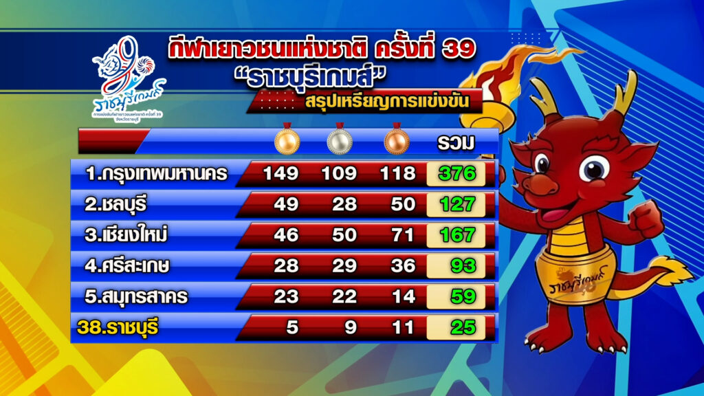 สรุปเหรียญ นักกีฬาเยาวชนจากกรุงเทพมหานคร ครองเจ้าเหรียญทอง สมัยที่ 34 มี 149 เหรียญทอง 109 เหรียญเงิน 118 เหรียญทองแดง ตามมาด้วยชลบุรี 49 เหรียญทอง และอันดับ 3 เชียงใหม่ 46 เหรียญทอง ขณะที่เจ้าพ ราชบุรี จบอันดับที่ 38 คว้ามาได้ 5 เหรียญทอง 9 เหรียญเงิน 11 เหรียญทองแดง