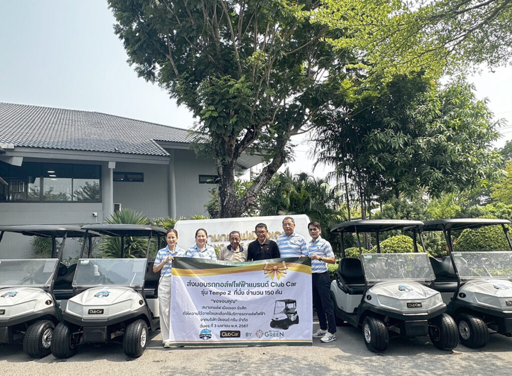 ขณะที่ นายอมฤต สุวรรณเศวต ประธานเจ้าหน้าที่บริหารบริษัทบียอนด์ กรีนจำกัด สนับสนุนการลดโลกร้อน ส่งมอบรถกอล์ฟไฟฟ้า CLUB CARรุ่นTEMPO 2 ที่นั่งจำนวน 150 คัน แก่ นายกุลวัต กาญจนศักดิ์ชัย ประธานบริหารบริษัทสนามกอล์ฟเมืองเอก จำกัด เพื่อบริการนักกอล์ฟ โดยมีนายสุเมธ บุญจันทร์ ผู้จัดการฝ่ายสัมปทานและรถเช่า,เจ้าหน้าที่บริษัทบียอนด์ กรีน จำกัดร่วมอยู่ด้วยที่สนามเมืองเอก กอล์ฟ คลับ รังสิต จังหวัดปทุมธานี