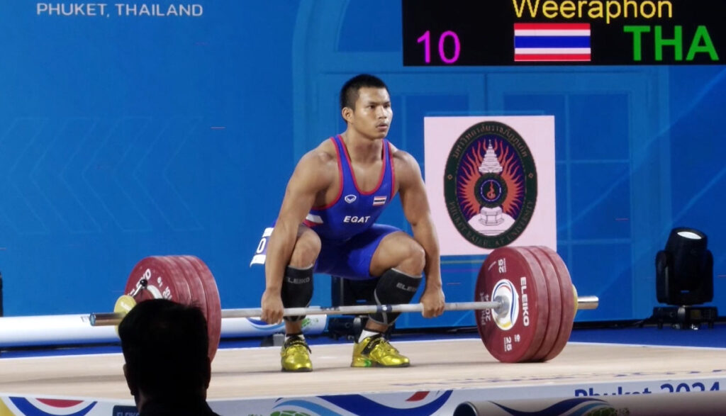 ศึกยกน้ำหนักเวิลด์ คัพ 2024 วันที่ 5 ที่มหาวิทยาลัยราชภัฏภูเก็ต จังหวัดภูเก็ต รุ่น 73 กิโลกรัมชาย กลุ่มเอ ไทยส่ง “เจ้าเวฟ” วีรพล วิชุมา จอมพลังหนุ่มทีมชาติไทยสังกัดสโมสรทหารอากาศ เจ้าของ 2 เหรียญทอง 1 เหรียญเงิน ยกน้ำหนักชิงแชมป์โลก 2023 ที่ซาอุดีอาระเบีย ลงไล่ล่าเหรียญทองแรกให้กับทีมจอมพลังไทย หลังจากที่คว้าโควตาปารีสเกมส์อย่างไม่เป็นทางการ ด้วยผลงานรั้งอันดับ 3 ในการควอลิฟายโอลิมปิกเกมส์ ท่าสแนชท์ วีรพล ยกครั้งแรกได้ 147 กิโลกรัม จากนั้นครั้งที่ 2 เรียกน้ำหนัก 150 กิโลกรัม แต่ยกไม่ผ่าน ก่อนที่ครั้งที่ 3 จะขยับน้ำหนักขึ้นไปที่ 151 กิโลกรัม แต่ยังยกไม่ผ่าน ทำให้สถิติอยู่ที่ 147 กิโลกรัม รั้งอันดับ 19