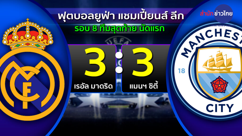 เกมอีกคู่ ยูฟ่า แชมเปียนส์ลีก รอบ 8 ทีมสุดท้าย นัดแรก เรอัล มาดริด 3-3 แมนฯ ซิตี้ นัดที่ 2 จะไปเล่นที่บ้านของซิตี้ ในวันที่ 17 เมษายน .-สำนักข่าวไทย