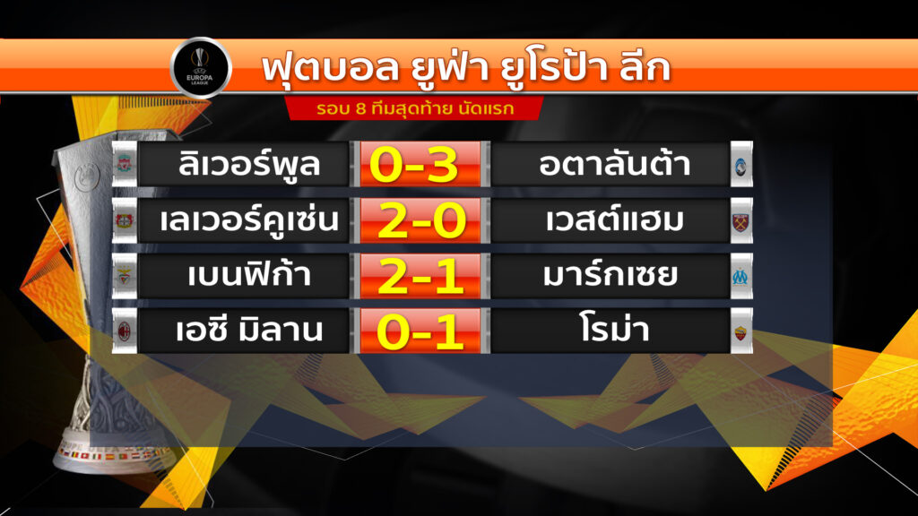 ฟุตบอล ยูฟ่า ยูโรป้า ลีก รอบก่อนรองชนะเลิศ นัดแรก เมื่อคืนนี้ ลิเวอร์พูล อดีตแชมป์รายการนี้ 3 สมัยจากอังกฤษ เปิดบ้านแพ้ อตาลันตา จากอิตาลี 0-3 โดยอตาลันตา ได้ประตูจากจาน ลูกา สคามัคกา ในนาทีที่ 38 และ 60 ส่วนอีกลูกมาจาก มาริโอ ปาซาลิช ในนาทีที่ 83 จบเกม อตาลันตา บุกชนะหงส์แดง 3-0 กุมความได้เปรียบก่อนกลับไปเล่นในบ้านในเกมนัดที่ 2 วันที่ 18 เมษายน