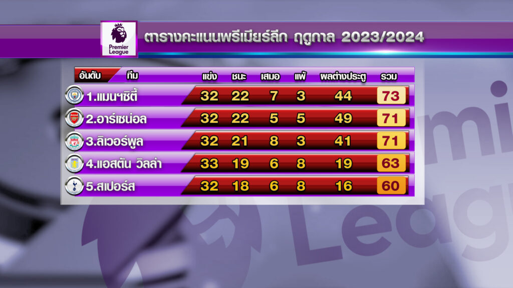 สรุปตารางคะแนนพรีเมียร์ลีก อังกฤษ อันดับ 1 แมนเชเสตอร์ ซิตี้ แข่ง 32 นัด มี 73 คะแนน อันดับ 2 อาร์เซน่อล แข่ง 32 นัด มี 71 คะแนนเท่ากับลิเวอร์พูล ทีมอันดับ 3 แต่ประตูได้เสียอาร์เซ น่อลดีกว่า