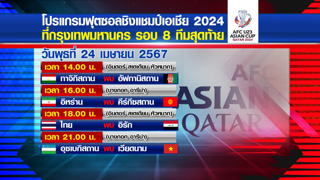 สำหรับโปรแกรม รอบ 8 ทีมสุดท้าย มีเตะ 4 คู่วันนี้ เริ่มเวลา 14.00 น. ทาจิกิสถาน พบ อัฟกานิสถาน ที่อินดอร์ สเตเดียม หัวหมาก เวลา 16.00 น. อิหร่าน พบ คีร์กีซสถาน ที่บางกอก อารีน่า เวลา 18.00 น. ไทย พบ อิรัก ที่อินดอร์ สเตเดียม หัวหมาก และเวลา 21.00 น. อุซเบกิสถาน พบ เวียดนาม ที่บางกอก อารีน่า .-สำนักข่าวไทย