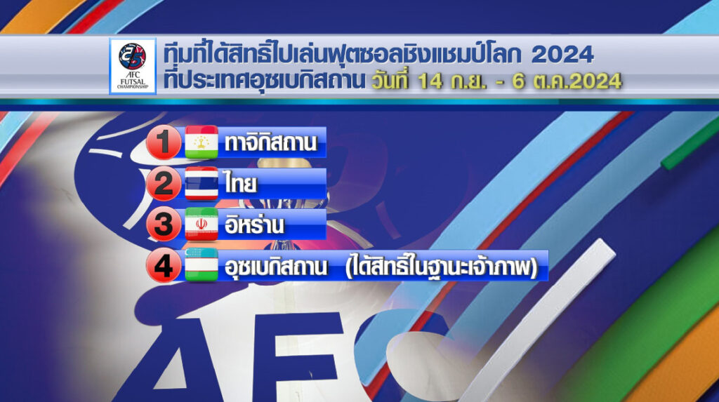 ฟุตซอลชิงแชมป์เอเชีย “เอเอฟซี ฟุตซอล เอเชียนคัพ 2024” ที่อินดอร์ สเตเดียม หัวหมาก ทีมชาติไทย ที่ได้สิทธิ์ไปลุยศึกฟุตซอลชิงแชมป์โลก 7 สมัยติดต่อกัน โดยเกมนี้ทีมไทยไม่มี มูฮัมหมัด อุสมานมูซา กองหน้าตัวเก่งที่ค้าแข้งในลีกสเปน และอภิวัฒน์ แจ่มเจริญ ตัวรุกจอมเก๋า ที่ติดโทษแบนจากโดนใบแดงเกม ชนะ อิรัก มาในรอบ 8 ทีมสุดท้าย พบกับ ทาจิกิสถาน ที่สร้างประวัติศาสตร์ ผ่านเข้ารอบรองชนะเลิศมาได้ในรอบ 25 ปี และยังสร้างประวัติศาสตร์ผ่านเข้าไปเล่นฟุตซอลชิงแชมป์โลกได้เป็นครั้งแรกในรอบ 35 ปีอีกด้วย