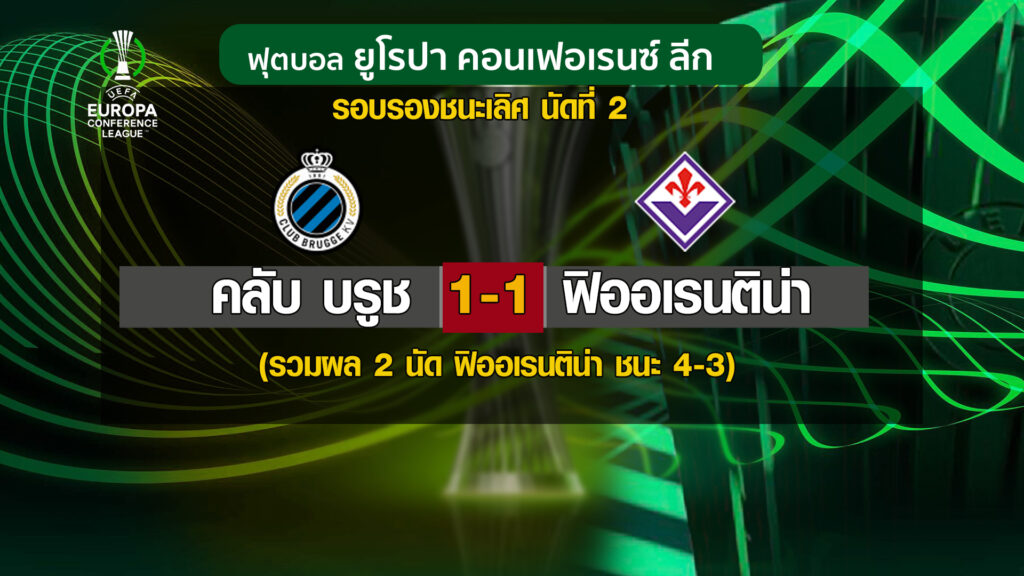 ส่วนผลฟุตบอลยูโรปา คอนเฟอเรนซ์ ลีก คลับ บรูช เสมอกับ ฟิออเรนตินา 1-1 ทำให้รวมผล 2 นัด ฟิออเรนตินา ชนะ 4-3 ผ่านเข้ารอบชิงชนะเลิศได้สำเร็จ .-สำนักข่าวไทย