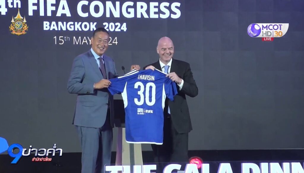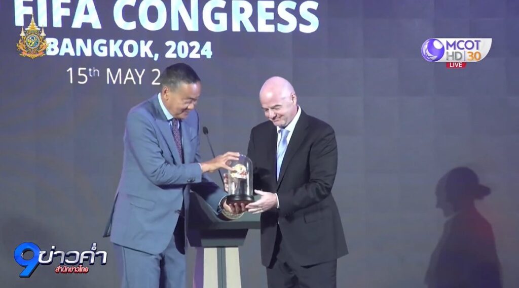 ด้าน จานนี อินฟานติโน ประธานฟีฟ่า มอบเสื้อหมายเลข 30 พร้อมสกรีนชื่อของนายกรัฐมนตรี เป็นที่ระลึก พร้อมกล่าวชื่นชมนายกฯ ว่าเป็นฟุตบอลแฟนตัวจริง เหตุผลที่เลือกกรุงเทพมหานคร เพราะเป็นถือเป็นหนึ่งในเมืองหลวงของโลก รวมถึงโลกฟุตบอล คนไทยคลั่งฟุตบอลมากจากที่เคยได้สัมผัสมาแล้ว การมาครั้งนี้ถือว่าเป็นการทำงานร่วมกับของฟีฟ่า ที่อยากจะยกระดับฟุตบอลไปด้วยกัน