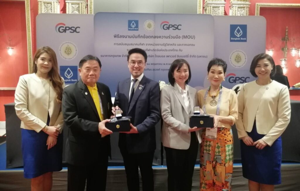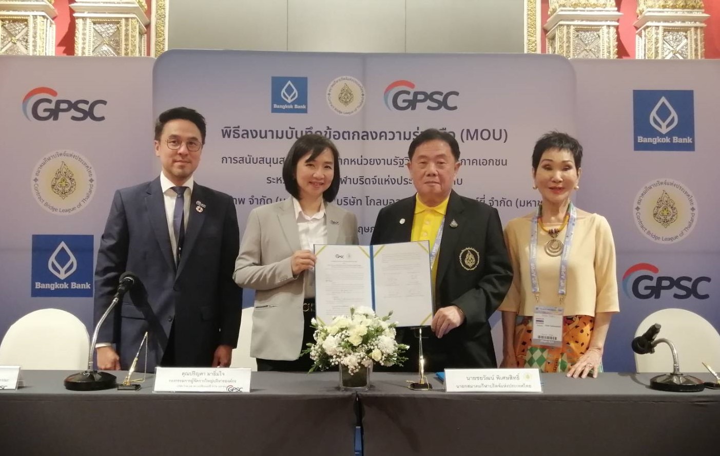 20 พ.ค.67 ที่โรงแรมมณเฑียร สุรวงศ์ กรุงเทพมหานคร สมาคมกีฬาบริดจ์แห่งประเทศไทย ได้จัดพิธีลงนามบันทึกข้อตกลงความร่วมมือ (MOU) ระหว่างสมาคมฯ กับ ธนาคารกรุงเทพ จำกัด (มหาชน ) และ บริษัท โกลบอล เพาเวอร์ ซินเนอร์ยี่ จํากัด (มหาชน) หรือ GPSC โดยมี นายชยวัฒน์ พิเศษสิทธิ์ นายกสมาคมกีฬาบริดจ์ฯ, นางปริญดา มาอิ่มใจ รองกรรมการผู้จัดการใหญ่บริหารองค์กร (มหาชน) ร่วมลงนาม โดยมี คุณหญิงชดช้อย โสภณพนิช ประธานสหพันธ์กีฬาบริดจ์ เอเซียแปซิฟิก และนายกกิติมศักดิ์สมาคมกีฬาบริดจ์ฯ พร้อมด้วย นายพัฑฒิ บุณยสุขานนท์ ผู้จัดการฝ่ายสื่อสารองค์กรและกิจการสาธารณะ GPSC ร่วมเป็นสักขีพยาน ในส่วนของธนาคารกรุงเทพนั้น ได้ดำเนินการในการลงนามบันทึกข้อตกลงความร่วมมือ เมื่อวันที่ 29 มี.ค.67 ที่ทำเนียบรัฐบาล เป็นที่เรียบร้อยแล้ว จึงไม่มีผู้แทนเข้าร่วมในครั้งนี้ โดย GPSC และ ธ.กรุงเทพฯ จะให้การสนับสนุนสมาคมฯ ปีละ 2 ล้านบาท เป็นระยะเวลา 4 ปี รวมการสนับสนุนทั้งหมด 16 ล้านบาท