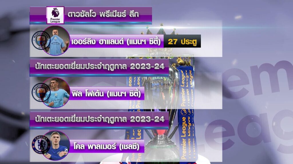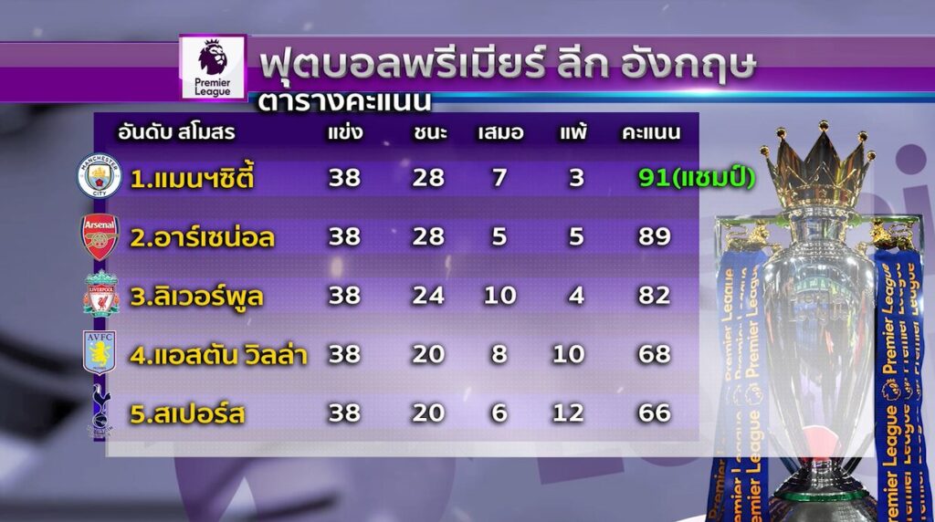 บทสรุปฟุตบอลพรีเมียร์ลีก อังกฤษ ฤดูกาล 2023-2024 “เรือใบสีฟ้า” แมนเชสเตอร์ ซิตี้ ทีมจ่าฝูง ลงเตะนัดสุดท้ายเปิดสนาม เอติฮัด สเตเดียม เอาชนะ เวสต์แฮม ยูไนเต็ด 3-1 มีเพิ่มเป็น 91 คะแนนจาก 38 นัด สร้างประวัติศาสตร์คว้าแชมป์ 4 สมัยติดต่อกันได้เป็นทีมแรก และเป็นการคว้าแชมป์สมัยที่ 6 จาก 7 ฤดูกาลหลัง ส่วนอาร์เซนอล ทีมอันดับ 2 เปิดบ้านชนะ เวสต์แฮม ยูไนเต็ด 2-1 มี 89 คะแนน ตามหลัง 2 คะแนน จบรองแชมป์ มี 89 คะแนน