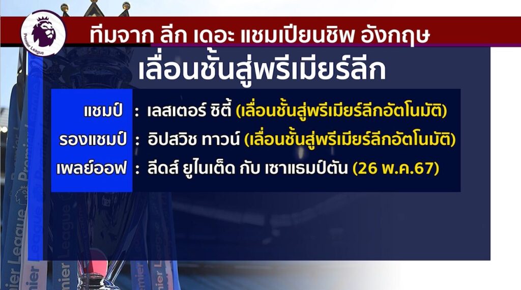 ส่วนทีมจาก ลีก เดอะ แชมเปียนชิพ อังกฤษ เลื่อนชั้นสู่พรีเมียร์ลีก แชมป์ : เลสเตอร์ ซิตี้ รองแชมป์ : อิปสวิช ทาวน์ และอีก 1 ทีมรอเพลย์ออฟ ระหว่าง ลีดส์ ยูไนเต็ด กับ เซาแธมป์ตัน ในวันที่ 26 พ.ค.นี้