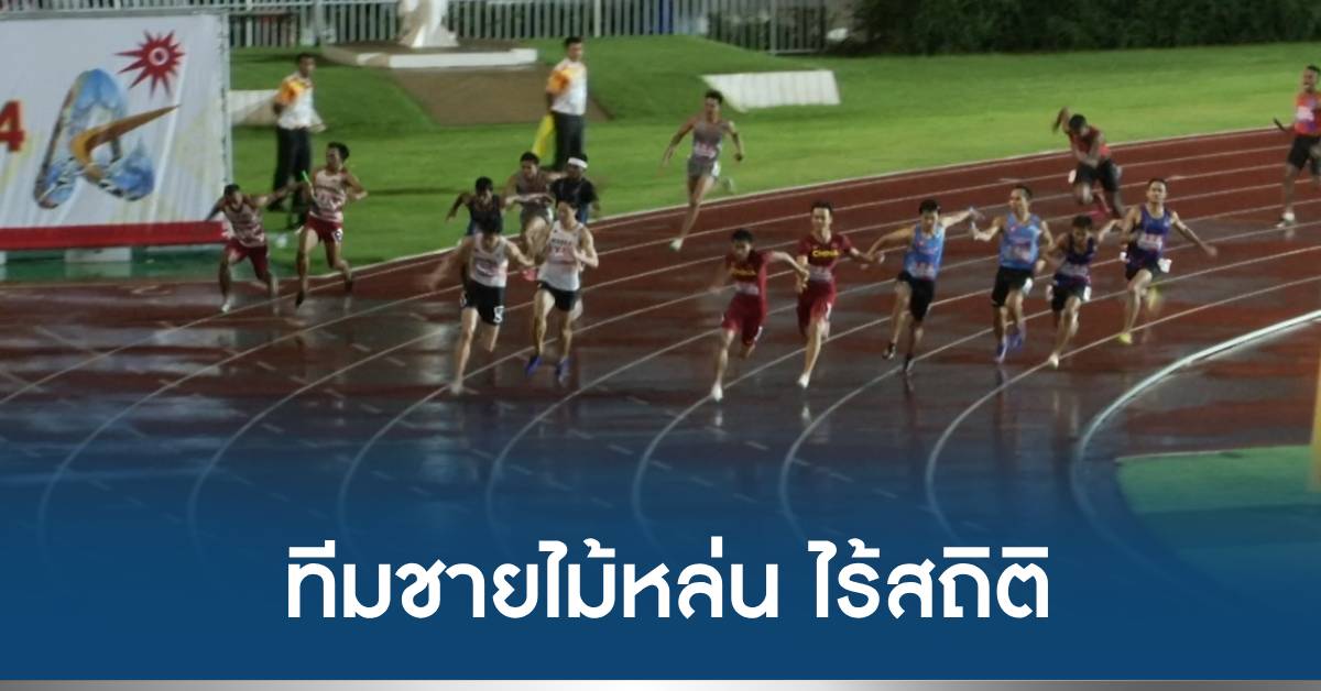 วิ่งผลัด 4×100 เมตรชาย ทีมไต้ฝุ่นไทย ขาด 2 ตัวหลักคือ ”เฉาก๊วย“ ชยุตม์ คงประสิทธิ์ ไม้ 3 กับ “บิว” ภูริพล บุญสอน ไม้ 4 โดยบิวยังอยู่ระหว่างการพักเนื่องจากอาการตึงจากการแข่งขันเมื่อต้นเดือน โดยส่ง ”โอ๊ต“ ธวัชชัย หีมเอียด ลงวิ่งแทนไม้ 3 ส่วน วีรยุทธ แดนขนบ ดาวรุ่ง ลงวิ่งในไม้ 4 ส่วนไม้ 1 “ไฟเตอร์” ณฐวรรธ เอี่ยมอุดม และไม้ 2 “ต้า” สรอรรถ ดาบบังปรากฏว่า ทีมใต้ฝุ่นไทยในช่องวิ่งที่ 1 เสื้อสีน้ำเงิน ทำไม้หลุดมือระหว่างการส่งไม้ จากไม้ 3 สู่ไม้ 4 ทำให้ไม่มีสถิติในรายการนี้ และยังไม่ได้ตั๋วไปโอลิมปิกเกมส์ 2024 ส่วนเหรียญทอง จีน 39.71 วินาที, เหรียญเงิน เกาหลีใต้ 39.93 วินาที และเหรียญทองแดง ฮ่องกง 40.14 วินาที.-สำนักข่าวไทย