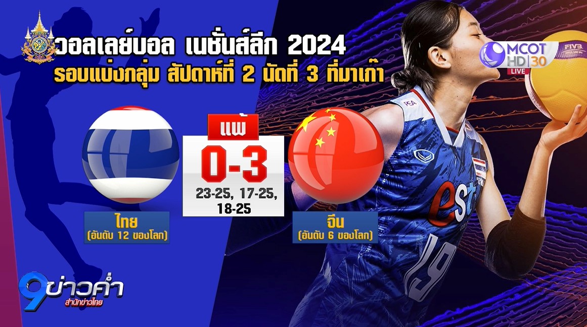 มาเก๊า 1 มิ.ย. – ทีมลูกยางสาวไทย แพ้ จีน 0-3 เซต ในการแข่งขันวอลเลย์บอลหญิงเนชั่นส์ลีก 2024 เกมนัดที่ 3 ของสัปดาห์ที่ 2