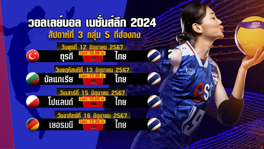 ส่วนโปรแกรมสัปดาห์ที่ 3 กลุ่ม 5 แข่งที่ฮ่องกง ทีมไทย พบกับ ตุรกี วันพุธที่ 12 มิถุนายน วันพฤหัสบดีที่ 13 มิถุนายน พบกับ บัลแกเรีย วันเสาร์ที่ 15 มิถุนายน พบ โปแลนด์ และ วันอาทิตย์ที่ 16 มิถุนายน พบ เยอรมนี.-สำนักข่าวไทย