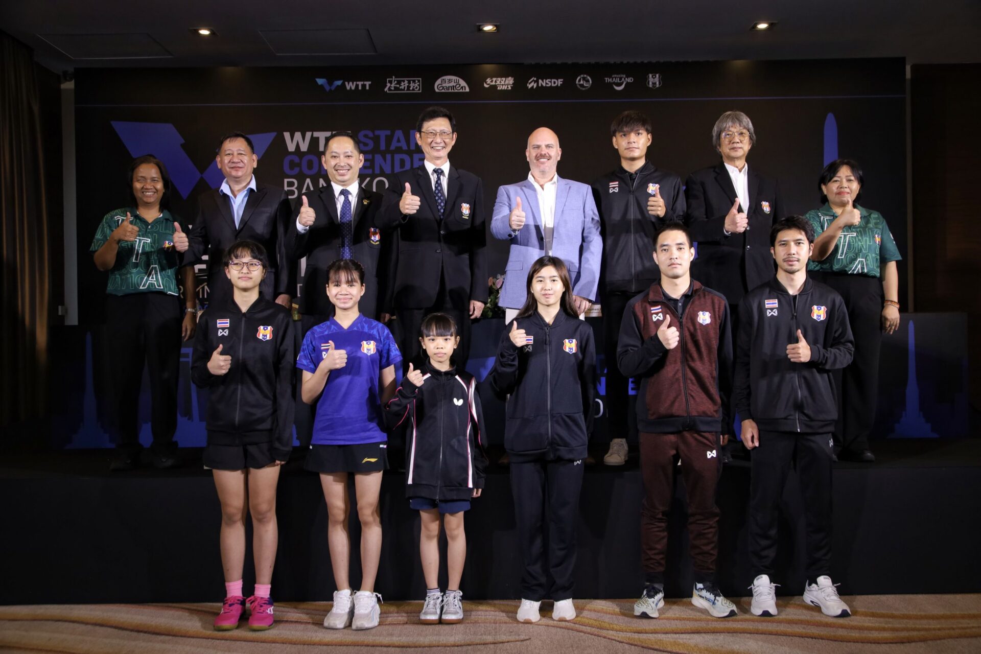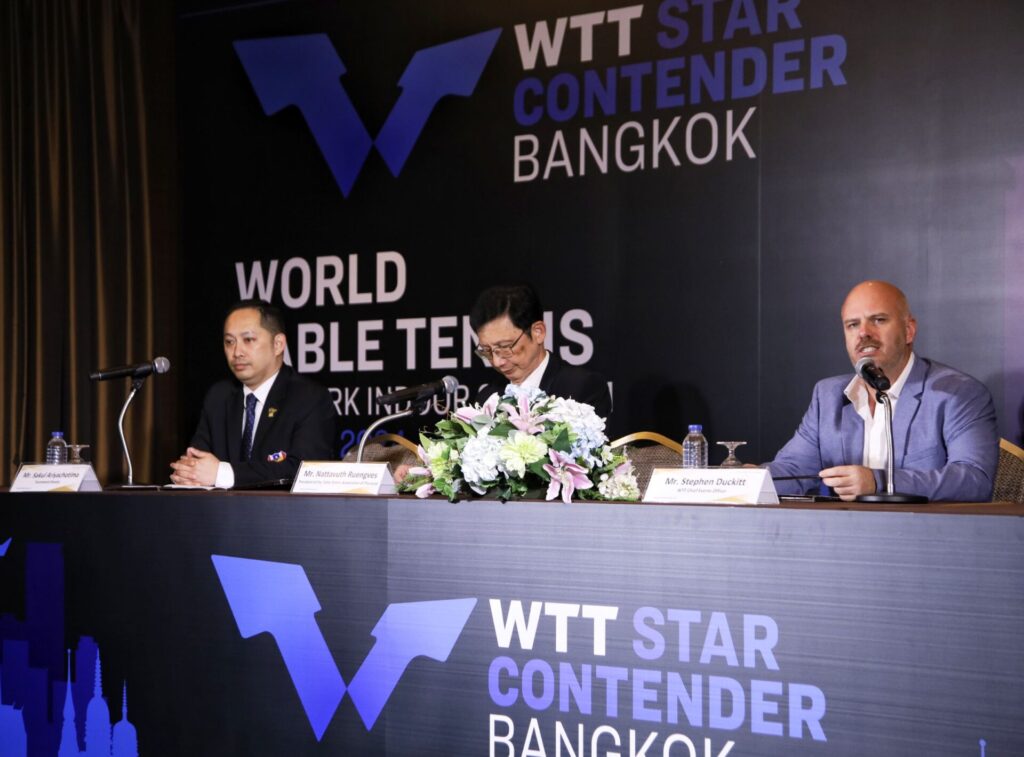 นายณัฐวุฒิ เรืองเวส นายกสมาคมกีฬาเทเบิลเทนนิสแห่งประเทศไทย พร้อมด้วย มร.สตีเฟ่น ดัคคิท ผู้จัดการแข่งขัน เวิลด์ เทเบิลเทนนิส หรือ ดับเบิลยูทีที และ นายสกุล อริยโชติมา ผู้อำนวยการจัดการแข่งขัน ร่วมแถลงความพร้อมจัดการแข่งขันเทเบิลเทนนิส นานาชาติ WTT Star Contender Bangkok 2024 ที่โรงแรม เดอะแกรนด์โฟร์วิงส์ เมื่อ 5 มิ.ย.ที่ผ่านมา