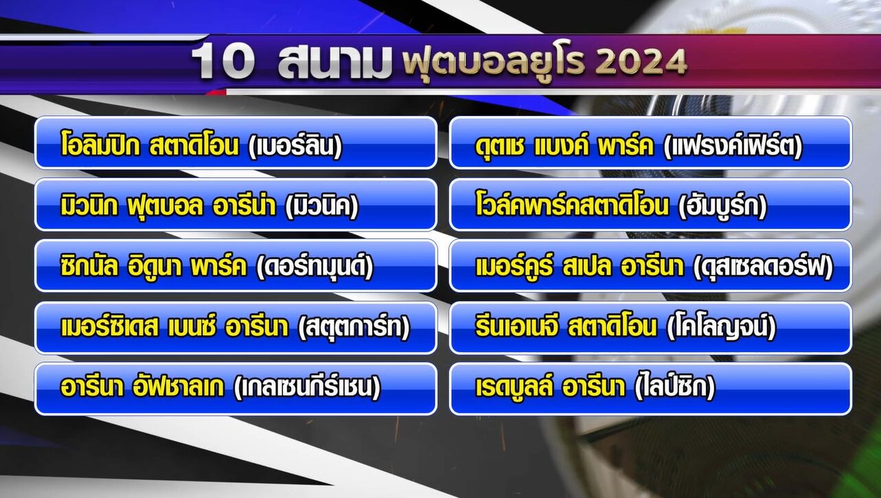 ฟุตบอลชิงแชมป์แห่งชาติยุโรปครั้งที่ 17 “ยูโร 2024” กำลังจะเปิดฉากขึ้น ในระหว่างวันที่ 14 มิถุนายน-14 กรกฎาคมนี้ ที่ประเทศเยอรมนี โดยเจ้าภาพจัดการแข่งขัน 10 สนาม ใน 10 เมือง ประกอบไปด้วย โอลิมปิก สตาดิโอน (เบอร์ลิน), มิวนิก ฟุตบอล อารีนา (มิวนิค), ซิกนัล อิดูนา พาร์ค (ดอร์ทมุนด์), เมอร์ซิเดส เบนซ์ อารีนา (สตุตการ์ท), อารีนา อัฟชาลเก (เกลเซนกีร์เชน), ดุตเช แบงค์ พาร์ค (แฟรงค์เฟิร์ต) ,โวล์คพาร์คสตาดิโอน (ฮัมบูร์ก) ,เมอร์คูร์ สเปล อารีนา (ดุสเซลดอร์ฟ) ,รีนเอเนจี สตาดิโอน (โคโลญจน์) และ เรดบูลล์ อารีนา (ไลป์ซิก)
