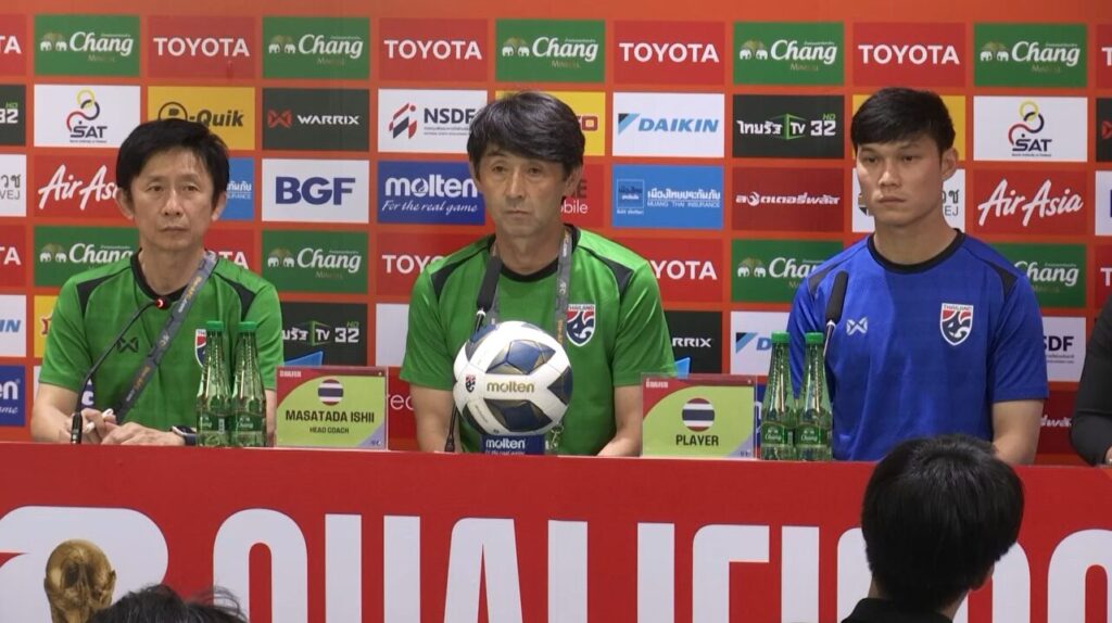 มาซาทาดะ อิชิอิ กุนซือทีมชาติไทยชาวญี่ปุ่น พร้อมกับ ปฏิวัติ คำไหม ผู้รักษาประตู ร่วมแถลงข่าวความพร้อม เมื่อวานนี้ ก่อนจะนำทัพช้างศึก ลงฝึกซ้อม เพื่อเตรียมทีมศึกฟุตบอลโลก 2026 รอบคัดเลือก โซนเอเชีย กลุ่มซี นัดสุดท้าย พบกับ ทีมชาติสิงคโปร์ ค่ำวันนี้ ที่ราชมังคลากีฬาสถาน